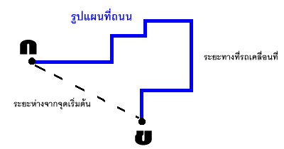 ถนนอาจเป็นทางตรง ทางโค้ง หรือหักเป็นมุมฉาก ระยะทางที่รถเคลื่อนที่อาจเป็นระยะทางตามตัวเลขที่ราบของการเคลื่อนที่ แต่หากบางครั้งเราจะพบว่า จุดปลายทางที่เราเดินทางห่างจากจุดต้นทางในแนวเส้นตรง หรือในแนวสายตาไม่มากนัก