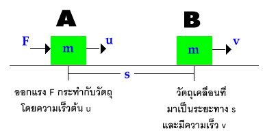 เมื่อออกแรง F กระทำต่อวัตถุ ทำให้วัตถุเคลื่อนที่จาก A ไปยัง B เป็นระยะทาง S