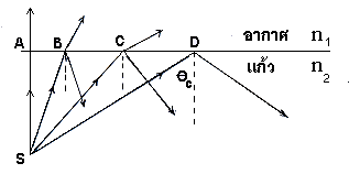 ให้จุดกำเนิดแสงอยู่ที่ S จะมีแสงออกจากจุด S นี้ไปยังจุดต่าง ๆ ของผิวแก้ว ดังรูป ที่จุด A แสงจะพุ่งออกจากแก้วไปยังอากาศโดยไม่มีการหักเห ที่จุด B จะมีการหักเหเล็กน้อย และมีบางส่วนสะท้อนกลับมาในแก้ว ที่จุด C จะมีการหักเหมากขึ้นเล็กน้อย และมีบางส่วนสะท้อนกลับมาในแก้ว ที่จุด D จะไม่มีการหักเห แสงจากจุด S ทั้งหมดจะสะท้อนกลับมาในแก้ว ณ. จุดนี้จะเรียกมุม